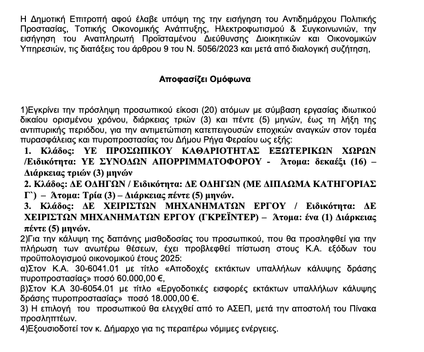 Ομόφωνα από την Δημοτική Επιστροπή η έγκριση πρόσληψης προσωπικού είκοσι ατόμων με σύμβαση εργασίας ιδιωτικού δικαίου ορισμένου χρόνου, διάρκειας τριών και πέντε μηνών, έως τη λήξη της αντιπυρικής περιόδου, για την αντιμετώπιση κατεπειγουσών εποχικών αναγκών στον τομέα πυρασφάλειας και πυροπροστασίας του Δήμου Ρήγα Φεραίου.