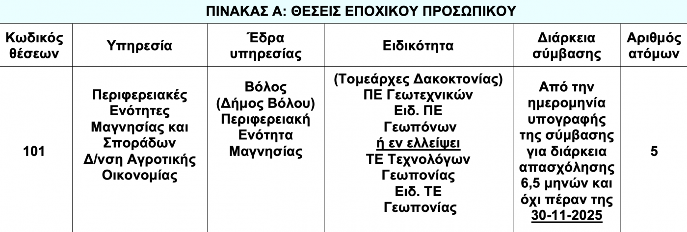 Την πρόσληψη, με σύμβαση εργασίας ιδιωτικού δικαίου ορισμένου χρόνου, συνολικά πέντε ατόμων για την κάλυψη αναγκών στο Πρόγραμμα Καταπολέμησης του Δάκου της Ελιάς έτους 2025 της Διεύθυνσης Αγροτικής Οικονομίας των Περιφερειακών Ενοτήτων Μαγνησίας και Σποράδων που εδρεύει στον Βόλο και συγκεκριμένα του εξής, ανά υπηρεσία, έδρα, κλάδο/ειδικότητα και διάρκεια σύμβασης, με τα αντίστοιχα απαιτούμενα προσόντα προκήρυηξε ο Περιφερειάρχης Θεσσαλίας.