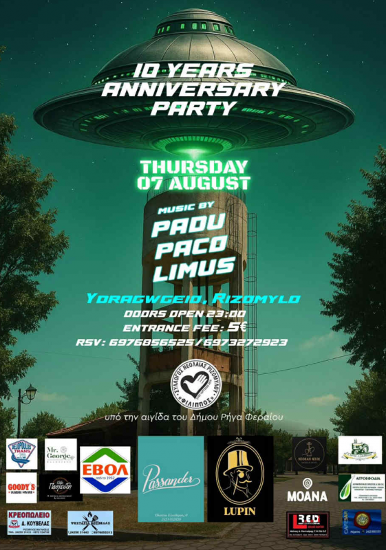Ο Σύλλογος Νεολαίας Ριζομύλου "ΦΙΛΙΠΠΟΣ" διοργανώνει αυτή την Πέμπτη 7 Αυγούστου το καθιερωμένο καλοκαιρινό πάρτυ, στο χώρο του Υδραγωγείου Ριζομύλου.