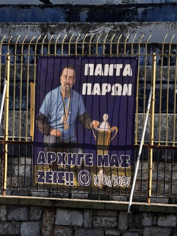 Τη μνήμη του Αχιλλέα Μακρή θέλησαν να τιμήσουν οι φίλοι του Ρήγα Φεραίου, δημιουργώντας ένα πανό με τον αείμνηστο Γενικό Αρχηγό των Κυανόλευκων να κρατά το Κύπελλο ΕΠΣΘ μετά τον περσινό νικηφόρο τελικό στο Πανθεσσαλικό.
