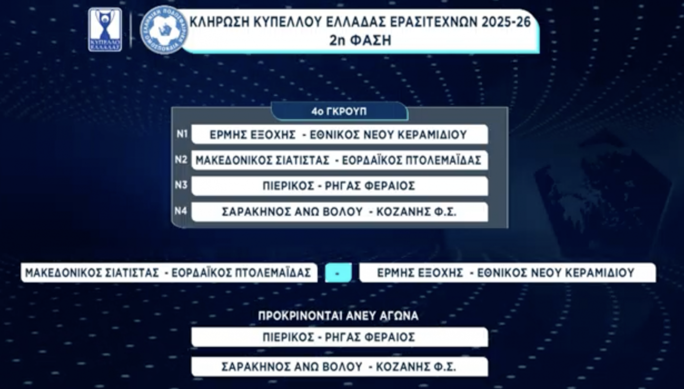 Σε εξέλιξη βρίσκεται στα γραφεία της ΕΠΟ η κλήρωση για τον θεσμό που επανέρχεται μετά το 2018 και συμμετέχουν οι ομάδες της Γ` Εθνικής και οι Κυπελλούχες των ΕΠΣ, με παρουσιάστρια την Ζέτα Θεοδωρακοπούλου και καλεσμένο τον προπονητή του Σαρακηνού, Γιάννη Μάγγο.