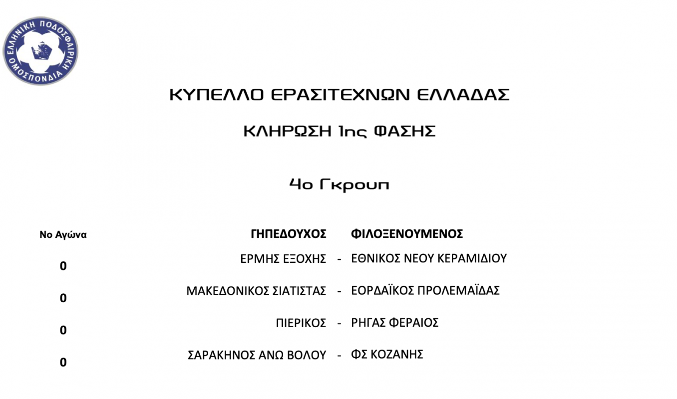 Διενεργήθηκε στα γραφεία της ΕΠΟ η κλήρωση της 1ης και της 2ης φάσης του Κυπέλλου Ερασιτεχνών Ελλάδας 2025-26, που "επιστρέφει" ύστερα από 7 χρόνια και προσφέρει ευκαιρία διάκρισης σε 98 ομάδες, οι οποίες είτε προέρχονται από την Γ΄ Εθνική είτε συμμετέχουν ως κυπελλούχοι ή φιναλίστ ΕΠΣ.