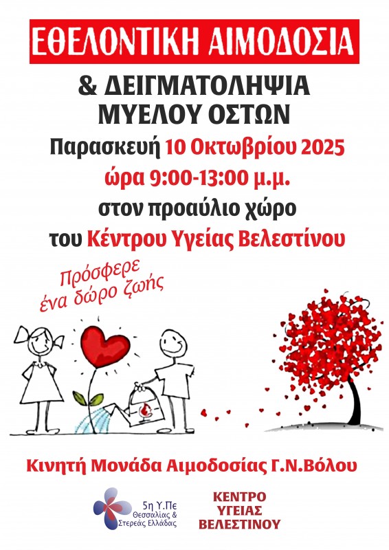 Την Παρασκευή 10 Οκτωβρίου 2025 και ώρα 9:00 π.μ. - 13:00 μ.μ. στον προαύλιο χώρο του Κέντρου Υγείας θα πραγματοποιηθεί Εθελοντική Αιμοδοσία και Εθελοντική Δειγματοληψία συμβατότητας δοτών μυελού των οστών με λήψη σάλιου, μία διαδικασία απλή, ακίνδυνη και ανώδυνη.