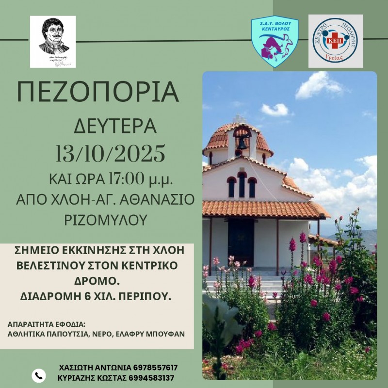Το ΚΕΠ Υγείας του Δήμου Ρήγα Φεραίου σε συνεργασία με τον Σύλλογο Δρομέων Υγείας Βόλου "ΚΕΝΤΑΥΡΟΣ" διοργανώνει τη 2η πεζοπορία, την Δευτέρα 13 Οκτωβρίου και ώρα 17.00 μ.μ.