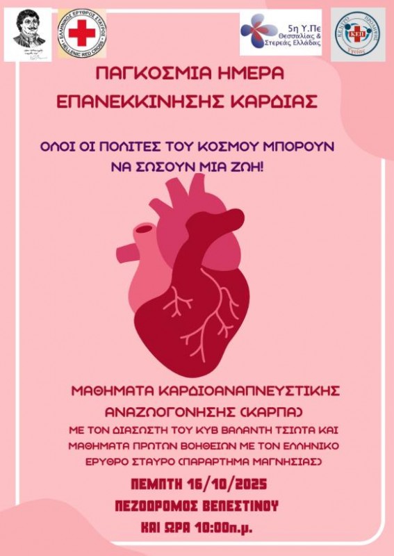 Το ΚΕΠ Υγείας του Δήμου Ρήγα Φεραίου με αφορμή τον εορτασμό της Παγκόσμια Ημέρα Επανεκκίνησης Καρδιάς, την Πέμπτη 16 Οκτωβρίου 2025 ανακοινώνει τη διοργάνωση μαθημάτων ΚΑΡΠΑ (Καρδιοαναπνευστικής Αναζωογόνησης) και Πρώτων Βοηθειών.