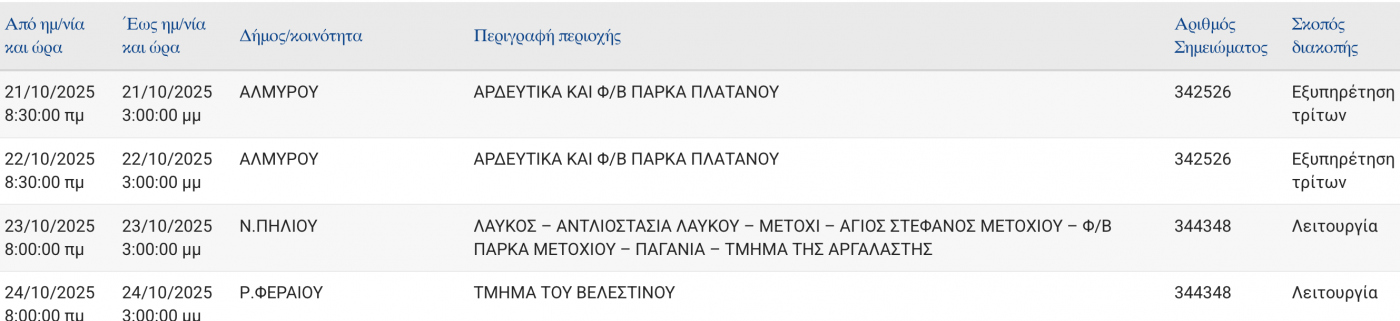 Διακοπές ηλεκτροδότησης την Παρασκευή σε τμήμα του Βελεστίνου