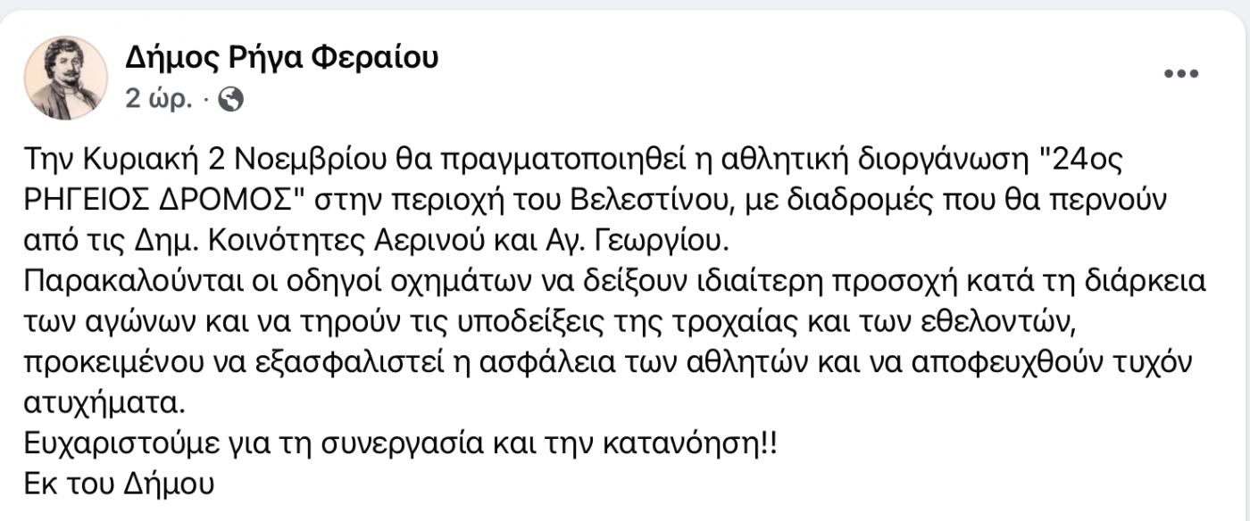 Η ανακοίνωση του Δήμου Ρήγα Φεραίου