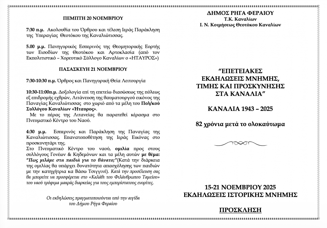 Την Κυριακή 16 Νοεμβρίου 2025 μετά τη θεία λειτουργία θα πραγματοποιηθεί η κατάθεση των στεφάνων στο Ηρώο. Κατόπιν με πορεία προς την πλατεία και στο σημείο όπου συγκεντρώθηκαν αρχικά οι όμηροι, στην κεντρική πινακίδα μνήμης, θα γίνει προσκλητήριο των θυμάτων από μαθητές του Λυκείου Καναλίων και άναμμα κεριών. Στη συνέχεια και ώρα 11.30 στο Μουσείο Λιμναίου Πολιτισμού θα κοινοποιηθούν οι δημιουργίες των μαθητών όλων των σχολικών βαθμίδων προς την ευρύτερη κοινότητα. Εφέτος, η διαδικτυακή ομάδα «Πρωτοβουλία για την ανάδειξη της ιστορίας των Καναλίων της Μαγνησίας» σχεδίασε και υλοποίησε το εκπαιδευτικό project «Η ιστορία μας μέσα απ’ τα μάτια των παιδιών». Οι μαθητές όλων των βαθμίδων ενημερώθηκαν για την τοπική ιστορία πολυτροπικά και κλήθηκαν να εκφράσουν εικαστικά, λεκτικά, θεατρικά τη δική τους δημιουργία, ατομικά ή ομαδικά. Η δράση αυτή υποστηρίζεται από την μαθητική και την εκπαιδευτική κοινότητα, τον αρμόδιο Σχολικό Σύμβουλο Π.Ε., τους Συλλόγους γονέων και το ΚΕ.ΜΕ.ΒΟ., με σθένος και αγάπη.