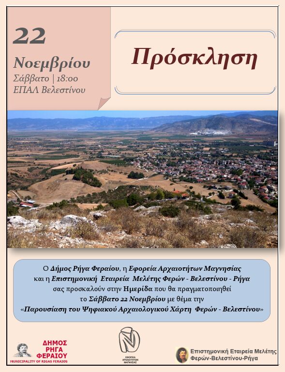Η Εφορεία Αρχαιοτήτων Μαγνησίας, ο Δήμος Ρήγα Φεραίου και η Επιστημονική Εταιρεία Μελέτης Φερών – Βελεστίνου – Ρήγα διοργανώνουν την πρώτη παρουσίαση του Ψηφιακού Αρχαιολογικού Χάρτη Φερών – Βελεστίνου, το Σάββατο 22 Νοεμβρίου 2025, από τις 18:00 έως τις 20:00, στο ΕΠΑΛ Βελεστίνου.