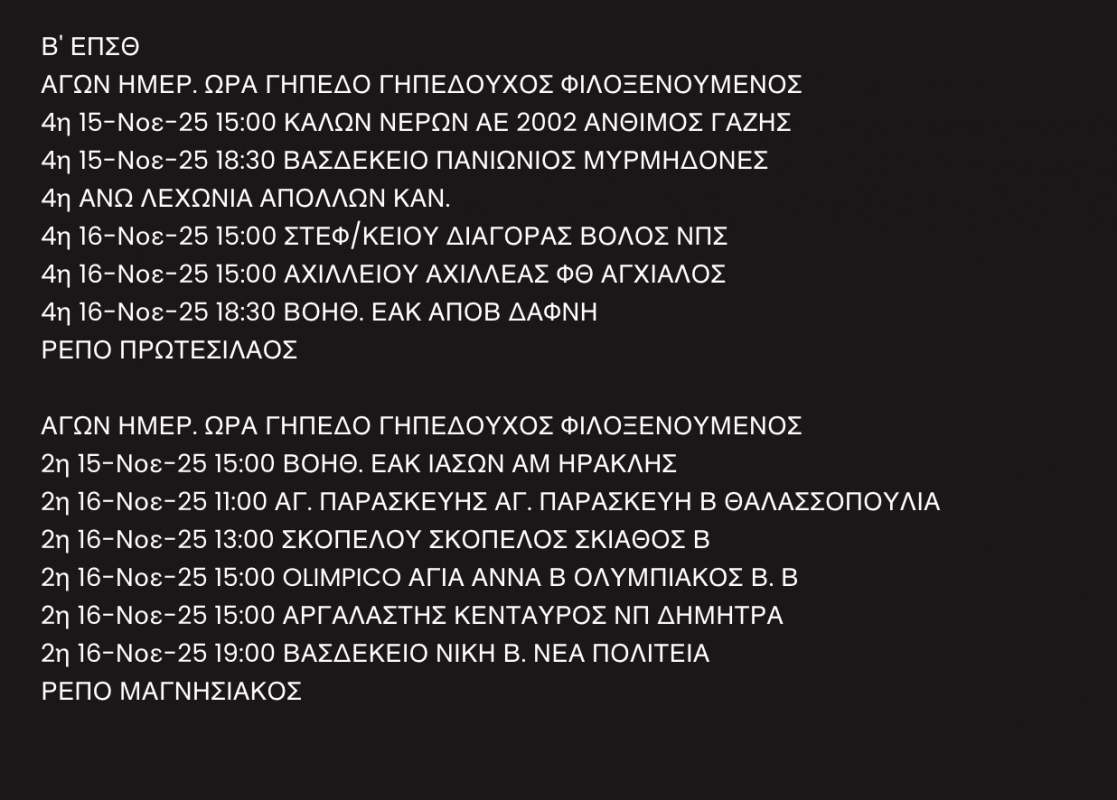 Αναλυτικά το πρόγραμμα της 4ης αγωνιστικής στην Β` ΕΠΣΘ και τα παιχνίδια της 2ης αγωνιστικής στην Γ` Τοπική κατηγορία που θα διεξαχθούν το ερχόμενο Σαββατοκύριακο (15-16/11).