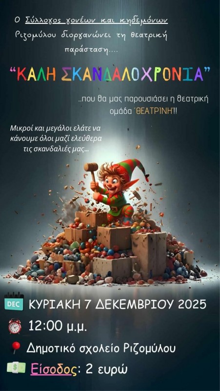 Ο Σύλλογος Γονένων και Κηδεμόνων Ριζομύλου διοργανώνει την θεατρική παράσταση "Καλή Σκανδαλοχρονιά" που θα μας παρουσιάσει η θεατρική ομάδα "Θεατρίνη".