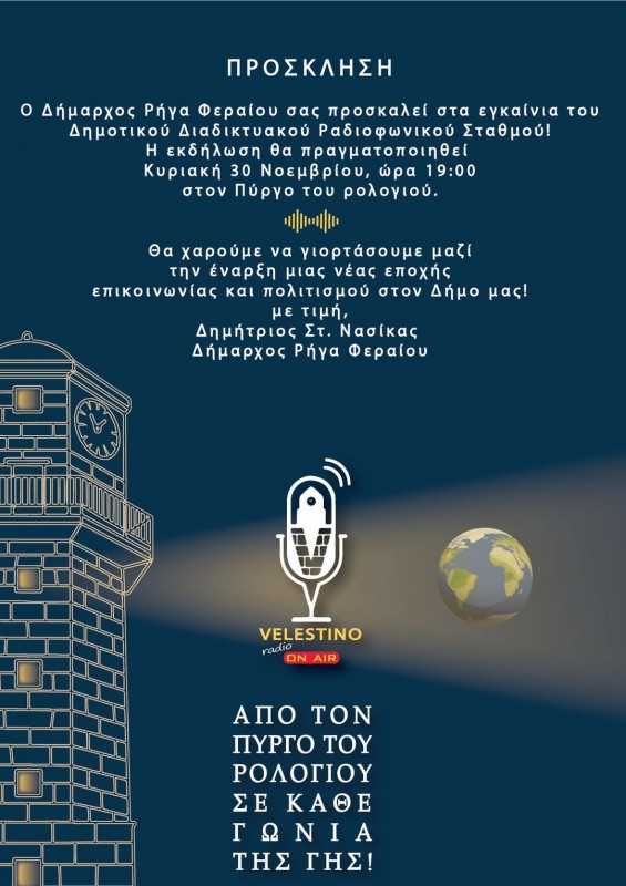 Την Κυριακή 30 Νοεμβρίου στις 7 το απόγευμα θα πραγματοποιηθεί η εκδήλωση εγκαινίων στο νέο Δημοτικό Διαδικτυακό Ραδιοφωνικό Σταθμό που θα φιλοξενείται στον Πύργο του Ρολογιού.