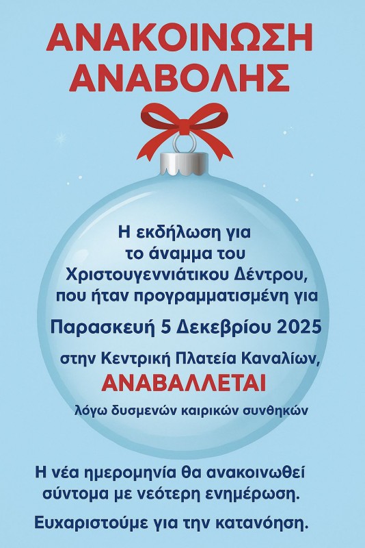 Η προγραμματισμένη για αύριο Παρασκευή (5/12) εκδήλωση φωταγώγησης του χριστουγεννιάτικου δέντρου στα Κανάλια αναβάλλεται λόγω δυσμενών καιρικών συνθηκών και θα πραγματοποιηθεί σε νέα ημερομηνία.