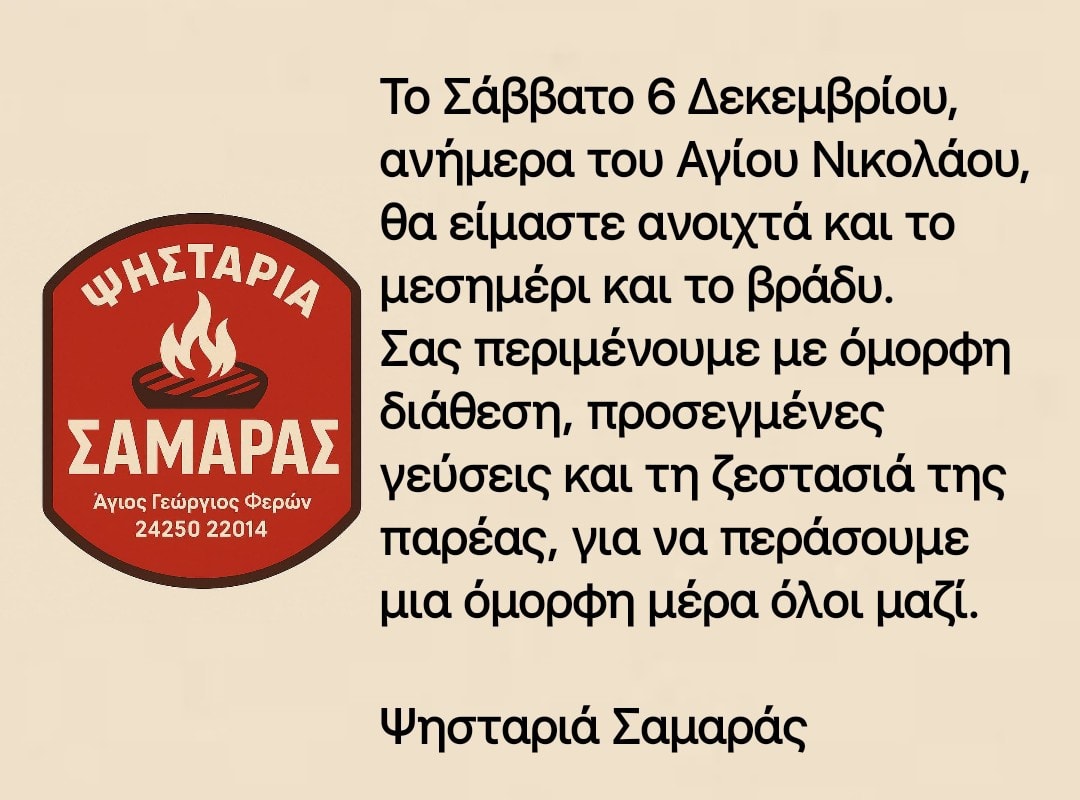 Το Σάββατο 6 Δεκεμβρίου ανήμερα του Αγίου Νικολάου θα είμαστε ανοιχτά και το μεσημέρι και το βράδυ.