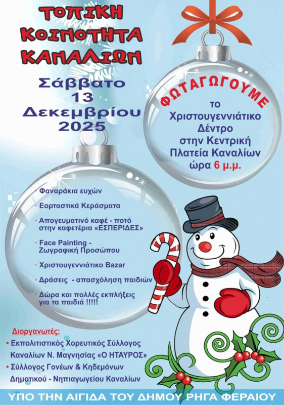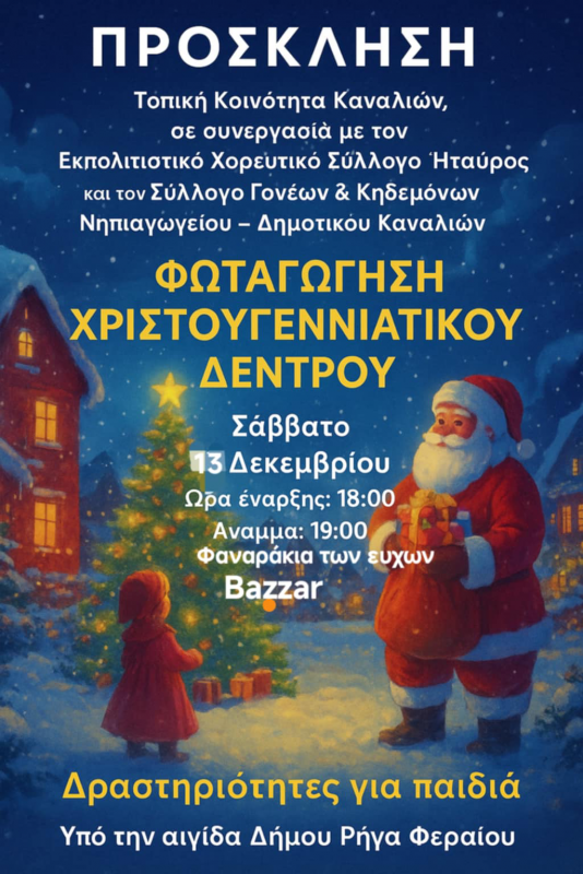 Εκδήλωση της Τοπικής Κοινότητας Καναλίων στην Κεντρική Πλατεία σε συνεργασία με τον "ΗΤΑΥΡΟ" και τον Σύλλογο Γονέων και Κηδεμόνων του Σχολείου, το Σάββατο 13 Δεκεμβρίου με ώρα έναρξης τις 18:00.