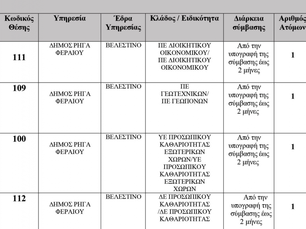 Την πρόσληψη τεσσάρων ατόμων με σύμβαση εργασίας ιδιωτικού δικαίου διάρκειας δύο μηνών ανακοίνωσε ο Δήμος Ρήγα Φεραίου.
