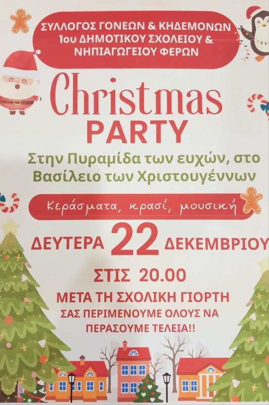 Ο Σύλλογος Γονέων και Κηδεμόνων 1ου Δημοτικού Σχολείου και Νηπιαγωγείου Φερών διοργανώνει χριστουγεννιάτικο πάρτι στην "Πυραμίδα των Ευχών" που βρίσκεται στο "Βασίλειο των Χριστουγέννων", το εορταστικό θεματικό πάρκο στην πλατεία Ρήγα Φεραίου Βελεστίνου.