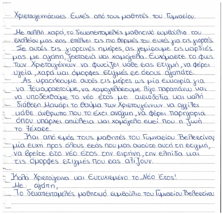 Το 15μελές μαθητικό συμβούλιο του Γυμνασίου Βελεστίνου ανέλαβε μία όμορφη και δημιουργική πρωτοβουλία, γράφοντας χριστουγεννιάτικες ευχές γεμάτες αισιοδοξία, ζεστασιά αλλά και ανθρωπιά.