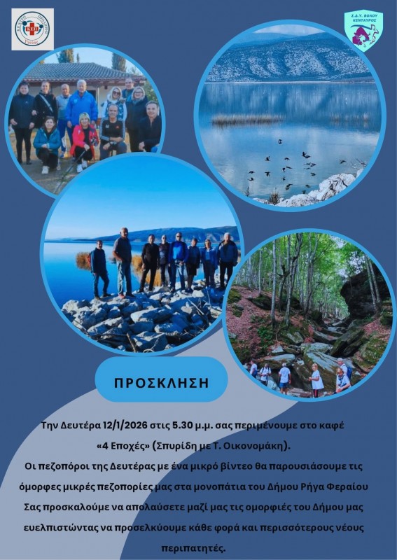Την Δευτέρα 12 Ιανουαρίου στις 17:30 σας περιμένουμε στο καφέ "4 ΕΠΟΧΕΣ" (Σπυρίδη με Τ. Οικονομάκη), οι πεζοπόροι της Δευτέρας με ένα μικρό βίντεο θα παρουσιάσουμε τις μικρές πεζοπορίες μας στα μονοπάτια του Δήμου Ρήγα Φεραίου.