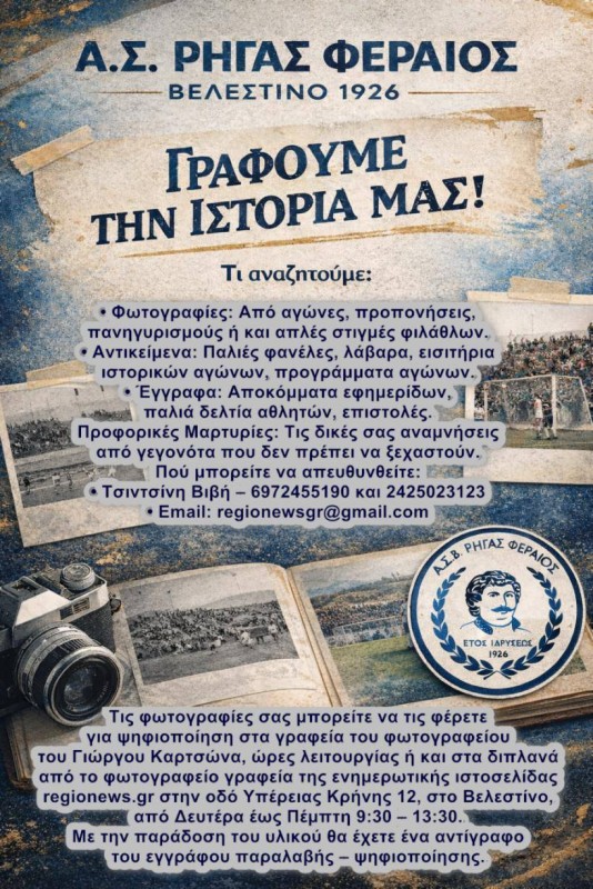 Πρόσκληση συγκέντρωσης υλικού προς όλους τους Βελεστινιώτες και φίλους της ομάδας από τον Ρήγα Φεραίο με αφορμή την επέτειο από τα 100 χρόνια ίδρυσης του συλλόγου