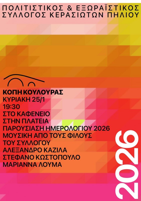 Ο Πολιτιστικός και Εξωραϊστικός Σύλλογος Κερασιωτών Πηλίου προσκαλεί όλους τους Κερασιώτες, τα μέλη και τους φίλους του χωριού στην πατροπαράδοτη κοπή της κουλούρας, η οποία θα πραγματοποιηθεί στο κοινοτικό κατάστημα στην Κερασιά την Κυριακή 25 Ιανουαρίου 2026 και ώρα 19:30.