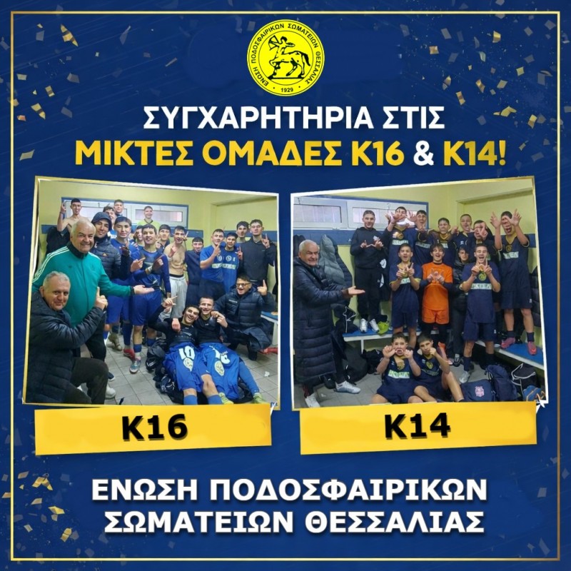 Ο Πρόεδρος κ. Μιλτιάδης Kαλόγηρος & η Εκτελεστική Επιτροπή της ΕΠΣΘ εκφράζουν τα θερμά τους συγχαρητήρια στις Μικτές Ομάδες Κ16 και Κ14 για την εξαιρετική τους πορεία στα φετινά πρωταθλήματα υποδομών της ΕΠΟ, εκπροσωπώντας επάξια το ποδόσφαιρο της Μαγνησίας σε πανελλήνιο επίπεδο.
