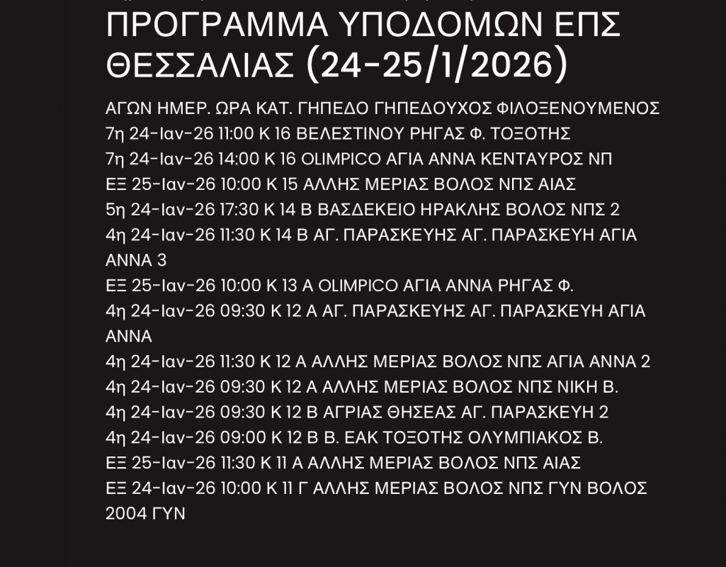 Η ΕΠΣ Θεσσαλίας έκανε γνωστό το πρόγραμμα για τους αγώνες Ακαδημιών το ερχόμενο Σαββατοκύριακο (24-15/1).