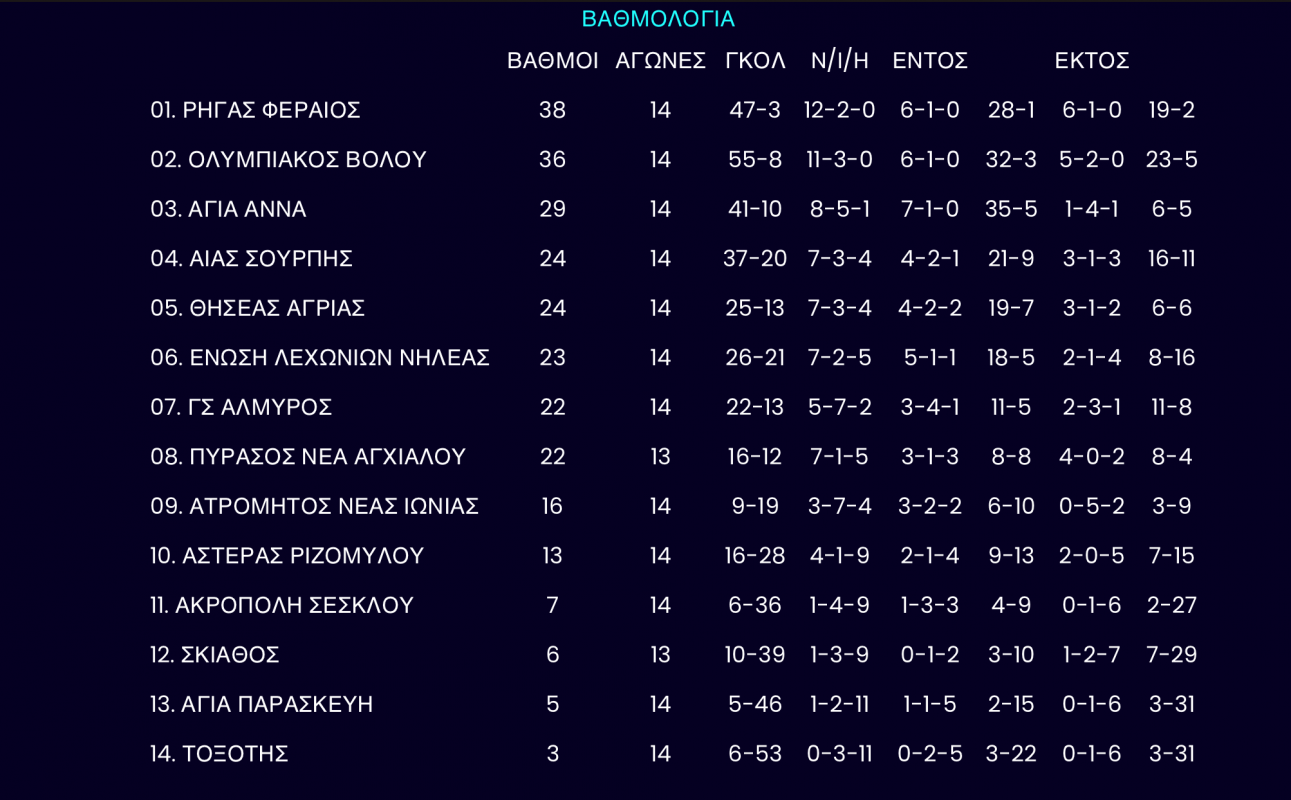Μία αγωνιστική μετά την έναρξη του δευτέρου γύρου στην Α` ΕΠΣΘ και με συνολικά 12 παιχνίδια να απομένουν για την ολοκλήρωση του πρωταθλήματος, ο πρωτοπόρος Ρήγας Φεραίος βρίσκεται στο "+2" από τον δεύτερο Ολυμπιακό Βόλου.