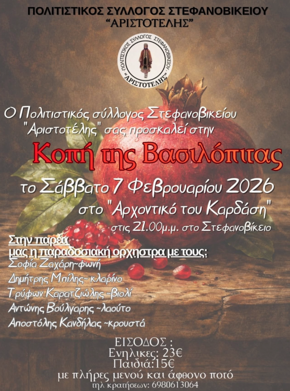 Ο Πολιτιστικός Σύλλογος Στεφανοβικείου "Αριστοτέλης" σας προσκαλεί στην κοπή της βασιλίπιτας το Σάββατο 7 Φεβρουαρίου στο κατάστημα "Αρχοντικό του Καρδάση", στις 9 το βράδυ στο Στεφανοβίκειο.