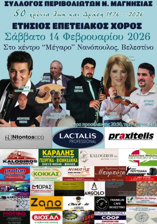 Το Σάββατο 14 Φεβρουαρίου στο κέντρο "Μέγαρο" του Βελεστίνου θα λάβει χώρο ο ετήσιος επετειακός χορός του Συλλόγου Περιβολιωτών Ν. Μαγνησίας.