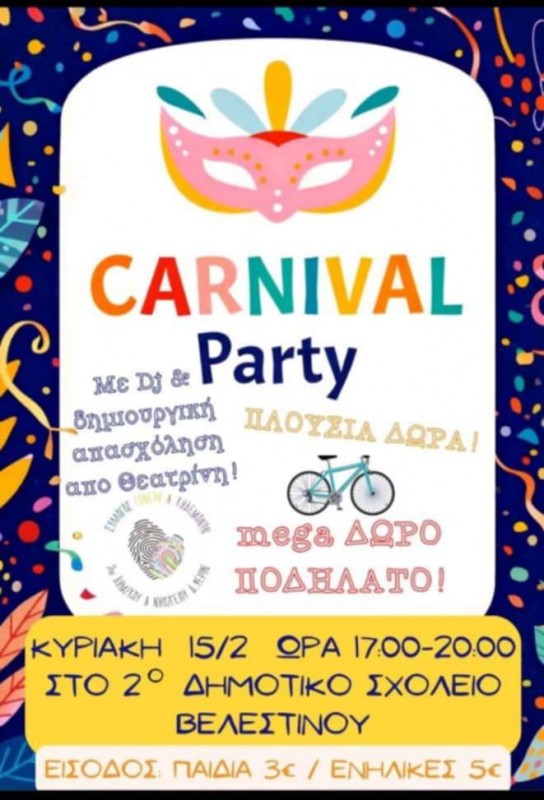 Αποκριάτικο Πάρτυ με Dj, δημιουργική απασχόληση για τα παιδιά από την Θεατρίνη και πλούσια δώρα την Κυριακή 15 Φεβρουαρίου, στις 17:00, στο 2ο Δημοτικό Σχολείο Βελεστίνου.