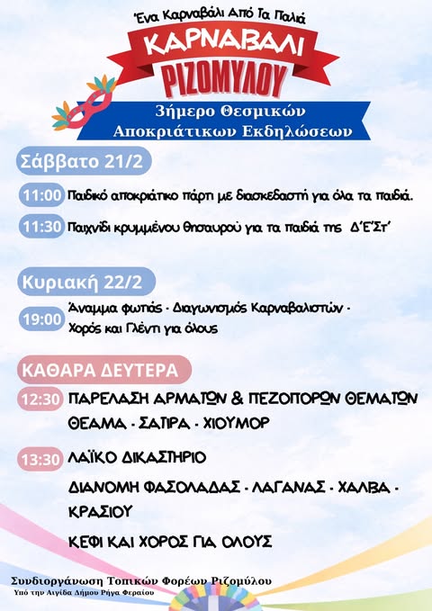 Με κέφι, χιούμορ και σάτιρα το φετινό καρναβάλι αναμένεται με ενδιαφέρον και προμηνύεται αντάξιο της Ριζομυλιώτικης αποκριάτικης ιστορίας.