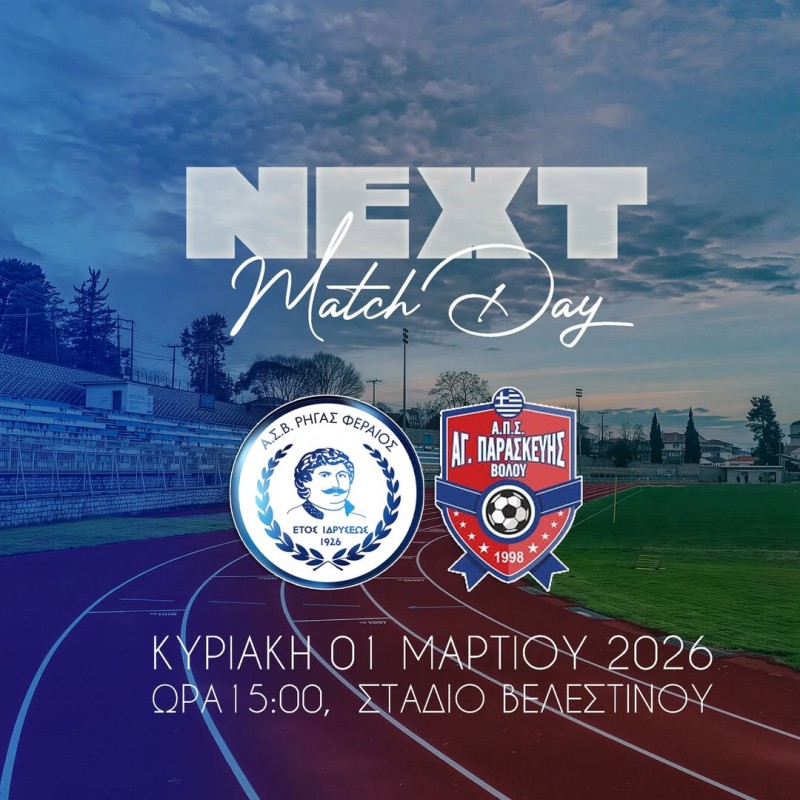 "Την Κυριακή, 1η Μαρτίου 2026, ο πρωτοπόρος Ρήγας Φεραίος υποδέχεται την ομάδα της Αγίας Παρασκευής στο Στάδιο Βελεστίνου στις 3 το απόγευμα.