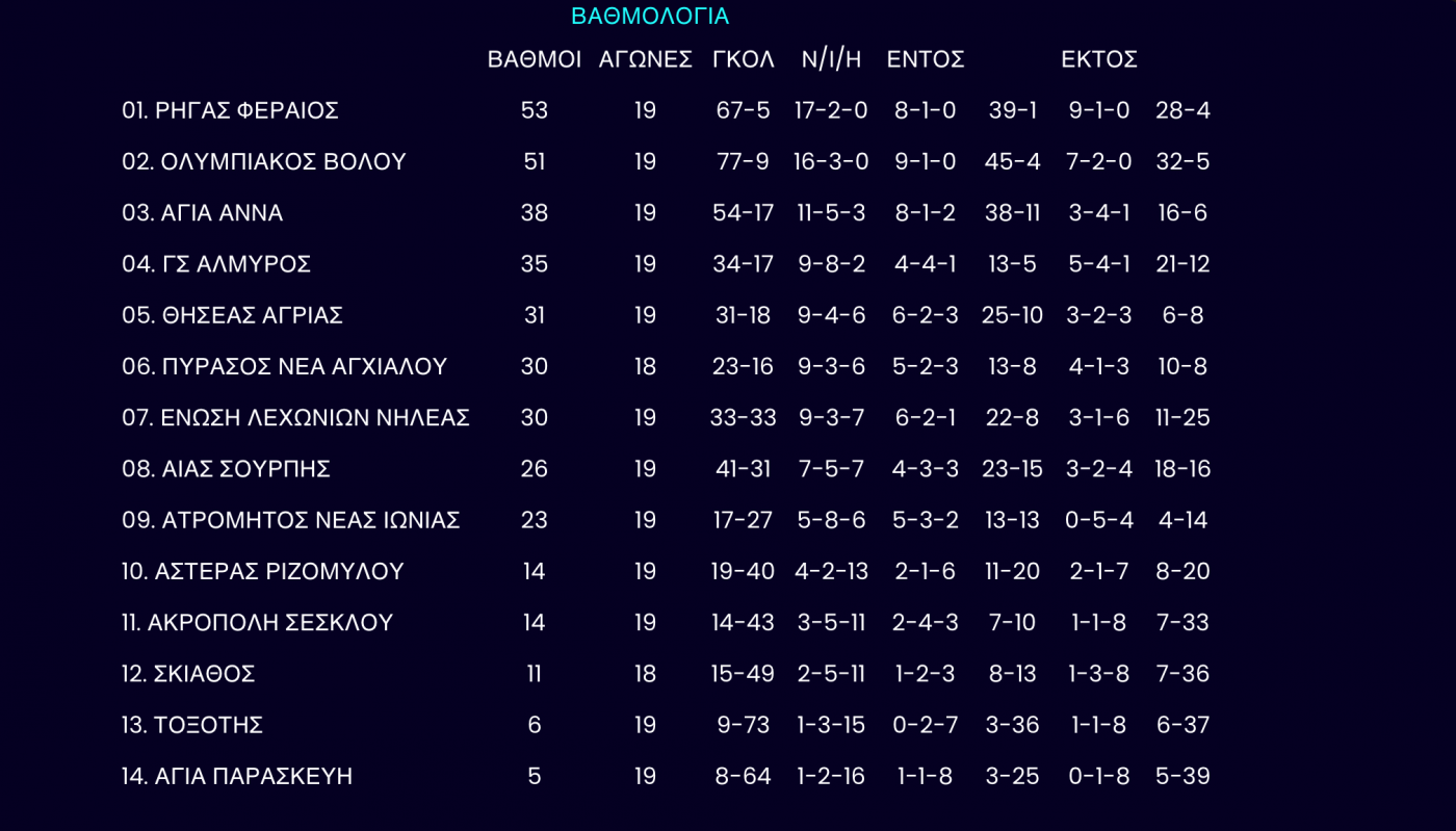 Με στόχο να διατηρηθεί στην μοναξιά της κορυφής και σε απόσταση, τουλάχιστον, δύο βαθμών από τον Ολυμπιακό Βόλου, ο Ρήγας Φεραίος αντιμετωπίζει το μεσημέρι της Κυριακής (15/3 - 13:30) την Σκιάθο στο στάδιο του νησιού των Σποράδων. Την ίδια μέρα στις 12 μ.μ. ο Αστέρας φιλοξενεί στον Ριζόμυλο την Αγία Παρασκευή.