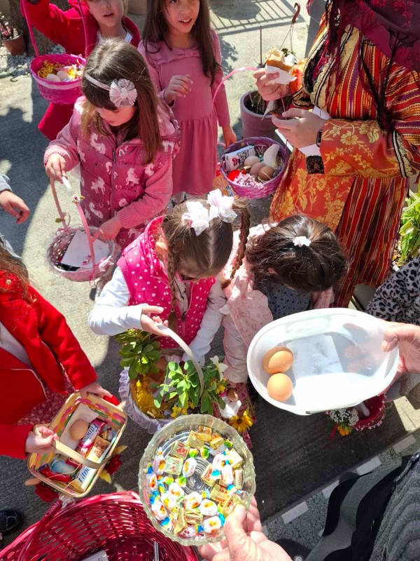 Οι νοικοκυρές που καλωσόριζαν τα νεαρά κορίτσια δίναν ως κέρασμα σε αυτά αυγά, που βάζανε στα καλαθάκια τους ή κάποια κεράσματα που είχαν στο σπίτι τους.