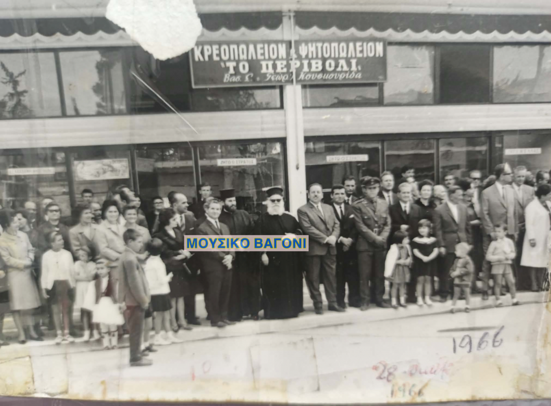 Μπροστά στο Κρεοπωλείο - Ψητοπωλείο "Το Περιβόλι" των Βασιλείου και Γεωργίου Κουσκουρίδα, διακρίνονται μεταξύ άλλων, ο ιερέας π. Αθανάσιος Καππής (με τα γυαλιά) και δίπλα του ο δήμαρχος Βελεστίνου Αντώνης Πάντος. Στα δεξιά της εικόνας με ένα παιδί μπροστά του εικονίζεται ο δάσκαλος Στέργιος Νασίκας και στα αριστερά του ο πρώην κοινοτάρχης, Ηρακλής Χατζάκος.