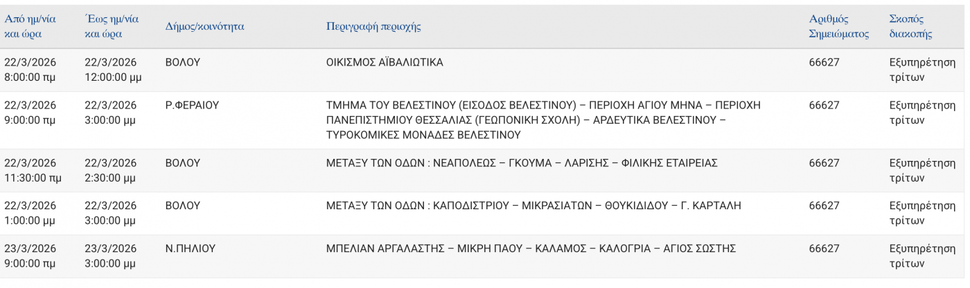 Διακοπές ρεύματος την Κυριακή σε τμήμα του Βελεστίνου
