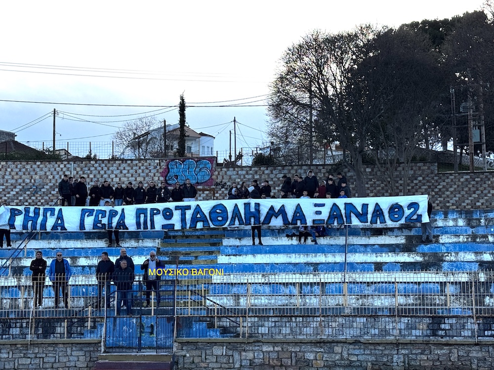 Μάλιστα, σηκώθηκε και το χαρακτηριστικό πανό που έγραφε "Ρήγα Γερά Πρωτάθλημα Ξανά - Θύρα 2".