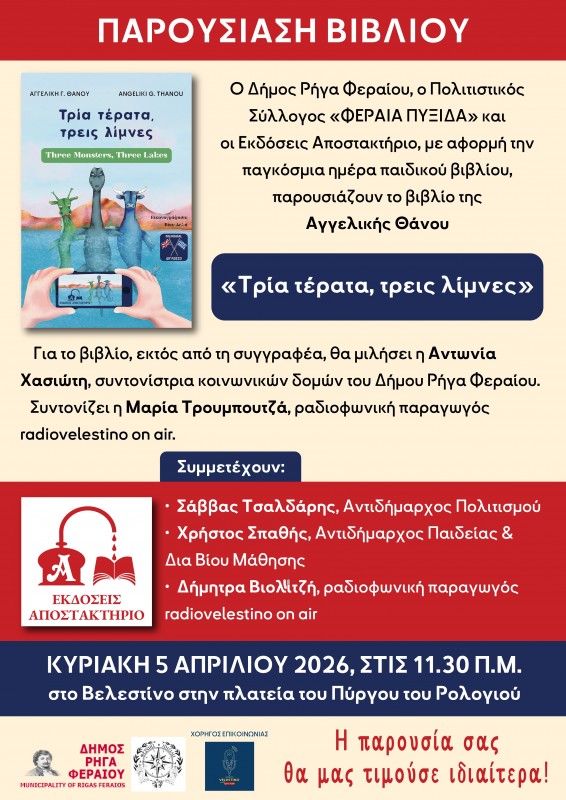 Με αφορμή την παγκόσμια ημέρα παιδικού βιβλίου ο Δήμος Ρήγα Φεραίου διοργανώνει παρουσίαση του πρόσφατου δίγλωσσου βιβλίου της συγγραφέως Αγγελικής Θάνου με τον τίτλο «Τρία τέρατα, τρεις λίμνες» από τις εκδόσεις Αποστακτήριο, την Κυριακή των Βαϊων, 5 Απριλίου και ώρα 11.30.