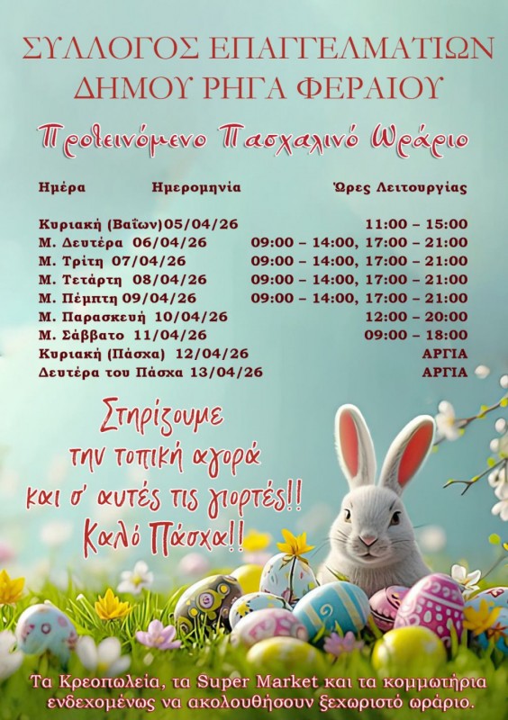 Με το μήνυμα "Στηρίζουμε την τοπική αγορά και σε αυτές τις γιορτές" καθώς και ευχές για Καλό Πάσχα ο Σύλλογος Επαγγελματιών Δήμου Ρήγα Φεραίου κοινοποίησε το προτεινόμενο ωράριο λειτουργίας την καταστημάτων.