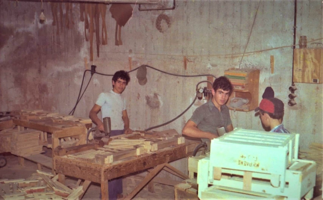 Το Ξυλουργείο Λεωνίδα Φώτη στην οδό Εθνικής Αντιστάσεως στο Βελεστίνο, την περίοδο που λειτουργούσε ως βιοτεχνία κατασκευής ξύλινων τελάρων (καφάσια) φρούτων - οπωροκηπευτικών.