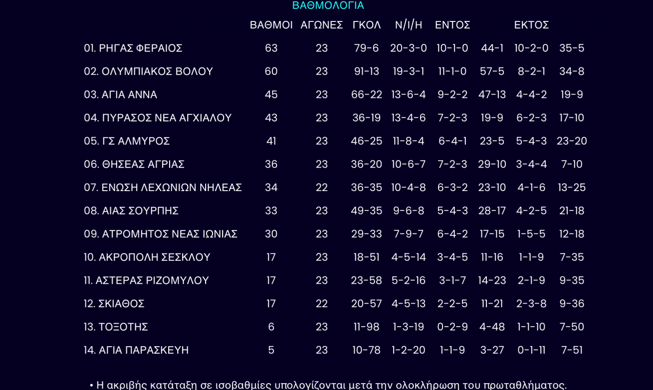 Οι Κυανόλευκοι διατήρησαν τη διαφορά των τριών βαθμών από τον Ολυμπιακό Βόλου που επικράτησε άνετα 7-0 του Αστέρα και χρειάζονται πλέον δύο νίκες στα επόμενα τρία παιχνίδια (εκτός Τοξότη, εντός Αλμυρό και Πύρασο) για να κατακτήσουν το πρωτάθλημα καθώς υπερτερούν με τους Βολιώτες και στην ισοβαθμία.