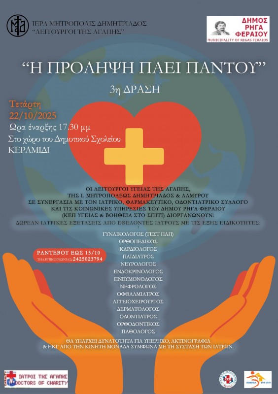 Την Τετάρτη 22 Οκτωβρίου 2025 στο Σχολείο της Τοπικής Κοινότητας Κεραμιδίου και ώρα 17:30μμ, το ΚΕΠ ΥΓΕΙΑΣ και οι Κοινωνικές Δομές του Δήμου Ρήγα Φεραίου, σε συνεργασία με τους Λειτουργούς της Αγάπης της Ι. Μητροπόλεως Δημητριάδος & Αλμυρού και με τον Ιατρικό, Φαρμακευτικό, Οδοντιατρικό Σύλλογο, διοργανώνουν δωρεάν ιατρικές εξετάσεις από εθελοντές ιατρούς με τις εξής ειδικότητες:
