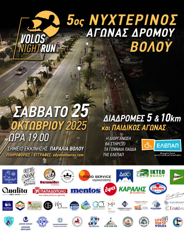 Ο 5ος Νυχτερινός Αγώνας Δρόμου Βόλου έρχεται το Σάββατο 25 Οκτωβρίου 2025, να φωτίσει την πόλη και να προσφέρει σε όσους πάρουν μέρος στα πέντε ή δέκα χιλιόμετρα, τη μαγεία του βραδινού τρεξίματος. Και για τους μικρούς μας φίλους παιδικοί αγώνες 500μ. και 1000μ.