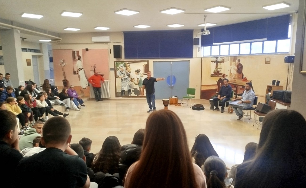 Η παράσταση ήταν διαδραστική: οι μαθητές συμμετείχαν ενεργά, χτύπησαν ρυθμούς, ταξίδεψαν μουσικά στον κόσμο και ήρθαν σε επαφή με νέες κουλτούρες.