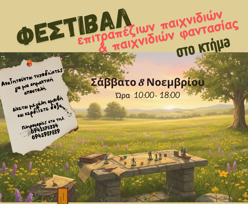 Ο Βόλος ετοιμάζεται να φιλοξενήσει ένα μοναδικό γεγονός για τους λάτρεις των επιτραπέζιων και φανταστικών παιχνιδιών. Η «ζΒόλος» – ΚοινΣΕπ, σε συνεργασία με τον Σύλλογο Επιτραπέζιων Παιχνιδιών Game-A-Lot Guild, το κατάστημα παιχνιδιών Roll’n’Trade και τη Λέσχη Ειδικών Δυνάμεων Ν. Μαγνησίας Vasilis Iliopoulos, διοργανώνουν το πρώτο Φεστιβάλ Επιτραπέζιων και Παιχνιδιών Φαντασίας της πόλης.