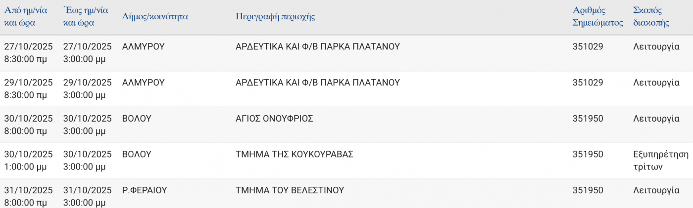 Βελεστίνο: Προγραμματισμένη διακοπή ηλεκτροδότησης την Παρασκευή
