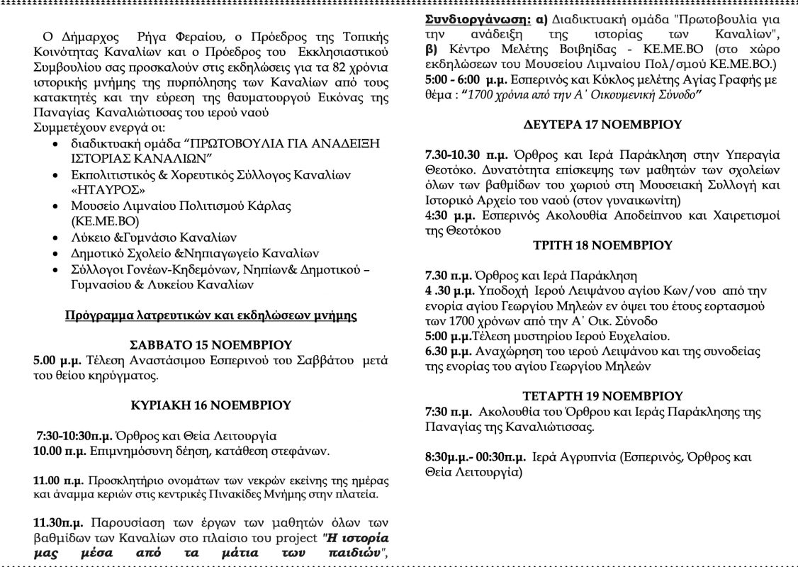 Οι πολυήμερες επετειακές εκδηλώσεις τιμής, μνήμης και προσκύνησης στα Κανάλια εμπλουτίζονται με πληθώρα λατρευτικών τελετών και ομιλιών επίσης. Περισσότερες πληροφορίες στα συνοδά φυλλάδια.