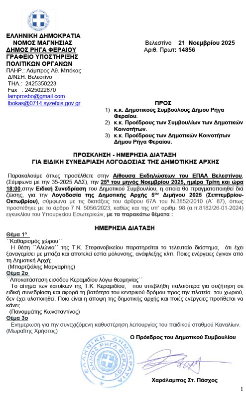 Την ερχόμενη Τρίτη 25 Νοεμβρίου και ώρα 18:00, μία ώρα πριν την τακτική συνεδρίαση του Δημοτικού Συμβουλίου Ρήγα Φεραίου, έχει προγραμματιστεί η ειδική συνεδρίαση λογοδοσίας της δημοτικής αρχής (Σεπτέμβριος - Οκτώβριος), στην αίθουσα του ΕΠΑΛ Βελεστίνου.