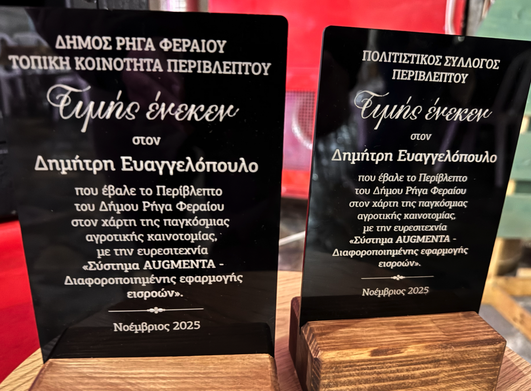 Ο Δημήτρης Ευαγγελόπουλος από το Περίβλεπτο τιμήθηκε απο την Τοπική Κοινότητα, τον Δήμο Ρηγα Φεραίου και τον Τοπικό Πολιτιστικό Σύλλογο γιατί έβαλε τον τόπο καταγωγής του στον χάρτη της παγκόσμιας αγροτικής καινοτομίας με την ευρεσιτεχνία "Σύστημα AUGMENTA".